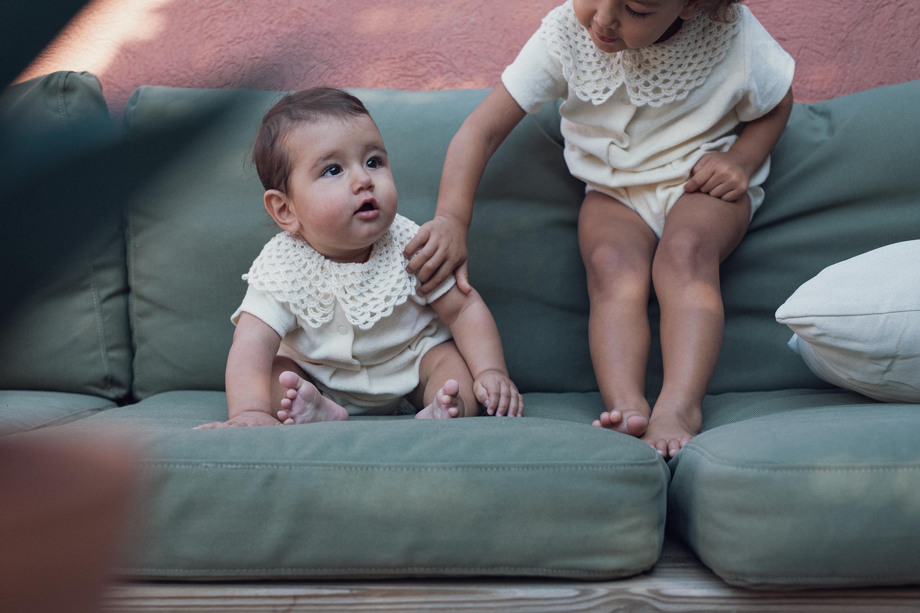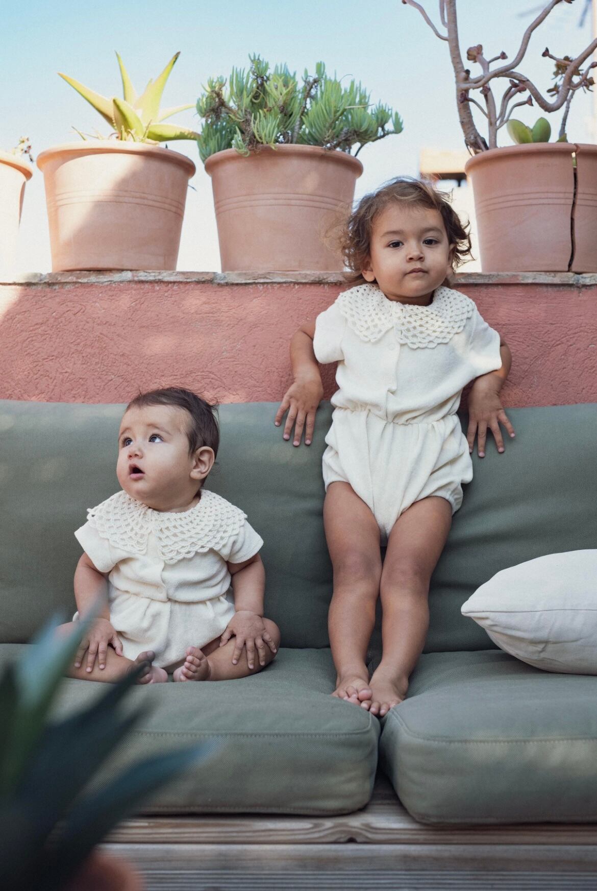 レトロフレンチでアイコニックな「MARSOU」ロンパースの再版!斜めにずれたクロシェの襟がポイントです!