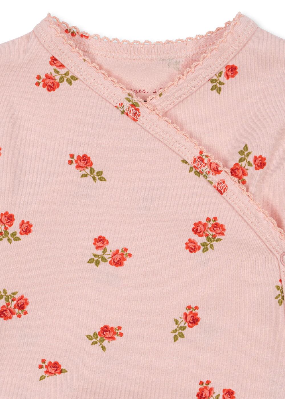 素材はオーガニックコットンを95%使用し、伸縮性を持たせるためにエラスタンを5%配合しています。サイド(側面)と股の部分はスナップボタンで開閉できるため、赤ちゃんのお着替えも簡単です◎