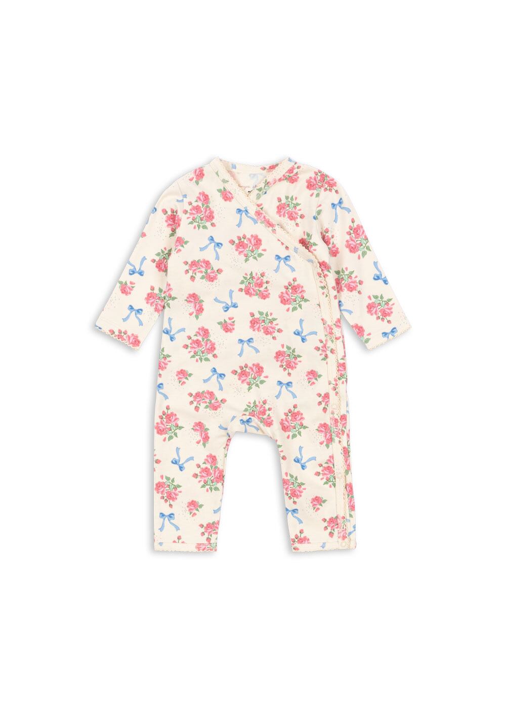 少し伸縮性のある、軽やかなコットン混素材を使用した、新生児向けの柔らかいロンパースです♡